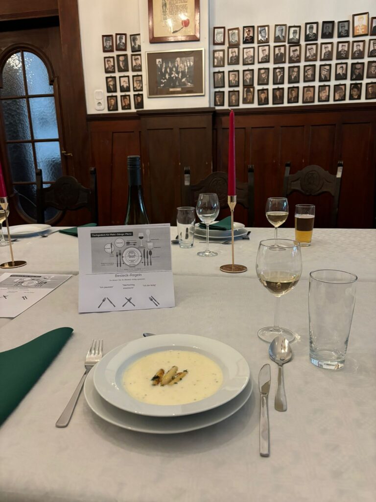 Aus diesem Anlass wurden wir unter der FĂŒhrung von unserem Bundesbruder Sepp durch das Knigge-Bootcamp geschickt. Zuerst wurden die Basics, wie keine Ellenbogen auf dem Tisch, adĂ€quate Serviettenverwendung, sowie angemessen Kleidung, zu bestimmten AnlĂ€ssen durchgegangen.